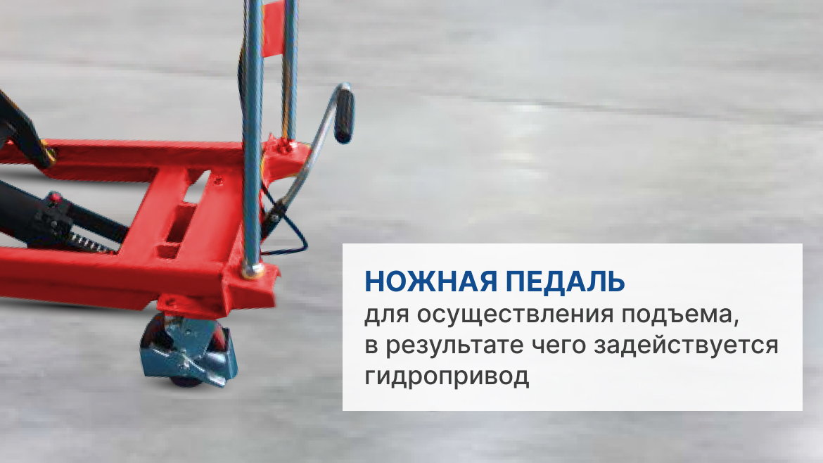 Подъём столешницы осуществляется двойным ножничным механизмом с гидравлическим приводом. Для осуществления подъема нажимается специальная ножная педаль, в результате чего задействуется гидропривод. Управляющая ручка имеет эргономичную форму.