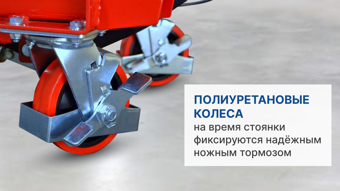 Шинки колесных опор изготовлены из полиуретана. Диаметр колеса 127 мм. На время стоянки колёса фиксируются надёжным ножным тормозом.