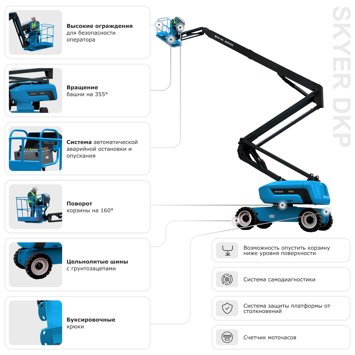 SKYER DKP2723 — компактный и маневренный самоходный дизельный коленчатый подъемник. Рабочая высота модели — 26.92 м, грузоподъемность — 230 кг. Оснащен стрелой с поворотным гуськом, который позволяет преодолевать препятствия и достигать сложных рабочих областей. Предназначен для эксплуатации на открытой местности, так как оборудован дизельным двигателем, который вырабатывает выхлопные газы в процессе работы. Использование подъемника в закрытых помещениях также возможно, но при условии хорошего проветривания.