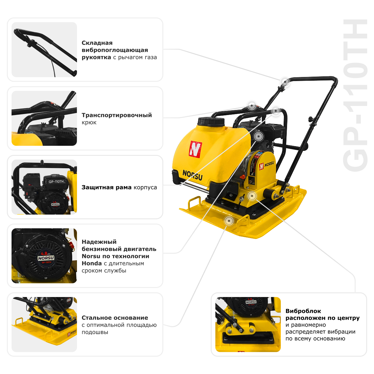 Прямоходная виброплита NORSU GP-110TH (с колесным комплектом) характеризуется маневренностью и простотой управления. Представляет собой уменьшенную версию катка-асфальтоукладчика, востребована при прокладке инженерных коммуникаций, выполнении строительных и дорожных работ, уплотнении дорожных покрытий. Встроенные колеса позволяют перемещать виброплиту на нужный участок легко и быстро. Оснащена двигателем HONDA GX200 мощностью 4800 Вт. Глубина уплотнения модели составляет 300 мм.