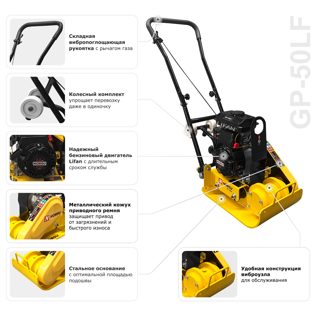 Прямоходная виброплита NORSU GP-50LF (с колесным комплектом) предназначена для утрамбовывания и уплотнения асфальта, бетона, гравия, песка и иного покрытия. Идеально подходит для выполнения работ в ограниченном пространстве — используется при укладке тротуарной плитки, устройстве дорожек в парках и зонах отдыха за счет малых габаритов и небольшого веса 50 кг. Оснащена двигателем Lifan 154F мощностью 2200 Вт. Глубина уплотнения модели составляет 150 мм.