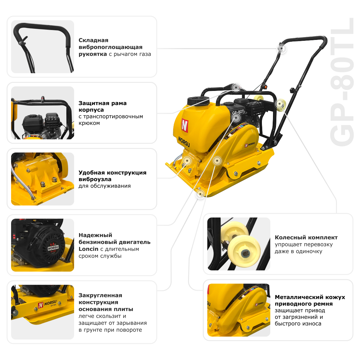 Прямоходная виброплита с баком для воды NORSU GP-80TL (с колесным комплектом) характеризуется надежностью и универсальностью. Представляет собой уменьшенную версию катка-асфальтоукладчика. Модель востребована при проведении дорожно-строительных работ, монтаже инженерных коммуникаций, уплотнении дорожных покрытий — везде, где отсутствуют условия для крупногабаритной техники. Оснащена двигателем Loncin H200 мощностью 4800 Вт. Глубина уплотнения модели составляет 300 мм.