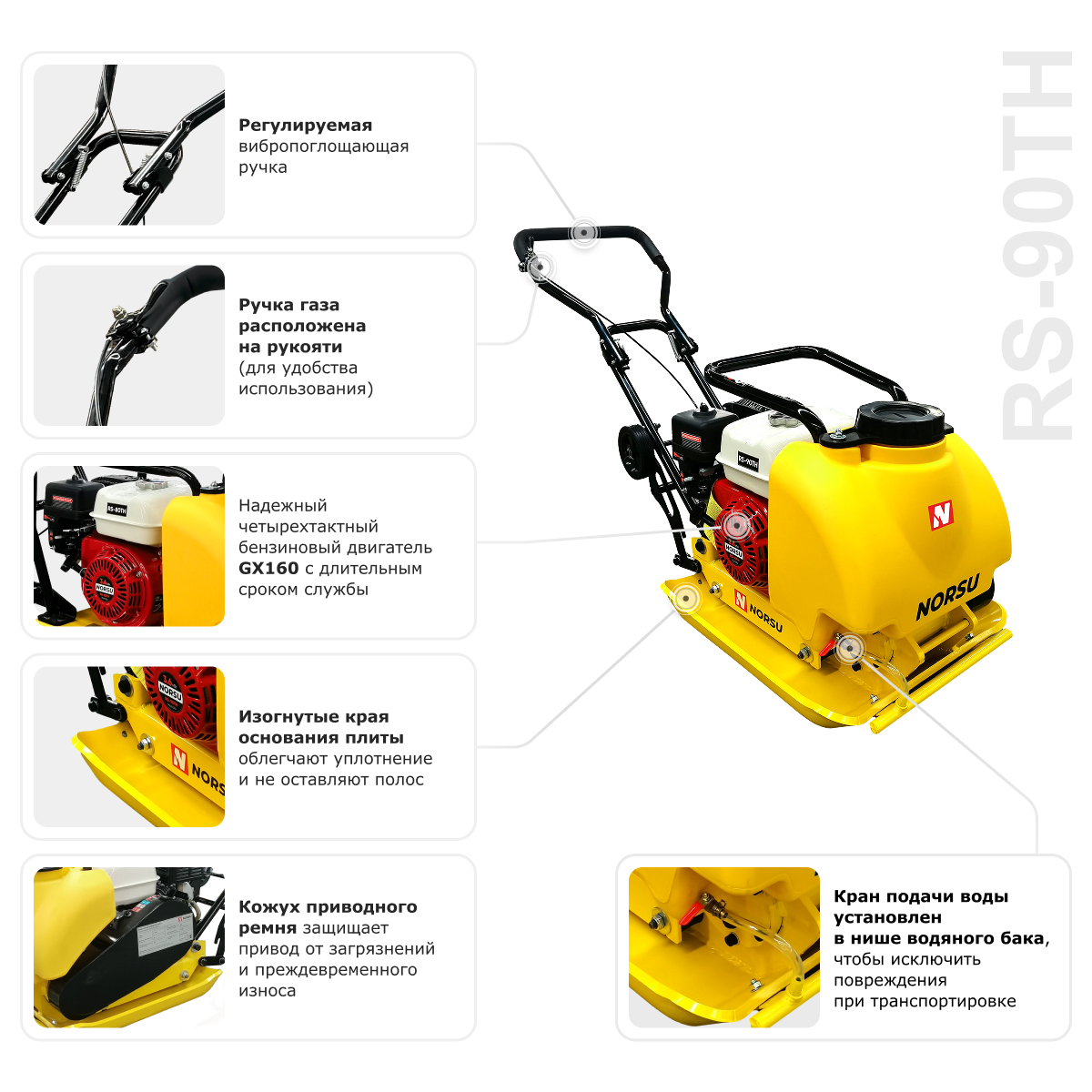 NORSU RS-90TH отлично зарекомендовала себя в работе с песчаным, гравийным основаниями, связными грунтами, подходит для работы в углах, ограниченном пространстве. Встроенные колеса позволяют быстро перемещать ее с одного рабочего участка на другой, минимизируя перерывы в работе. Глубина уплотнения составляет 300 мм, объем топливного бака — 3.1 л.