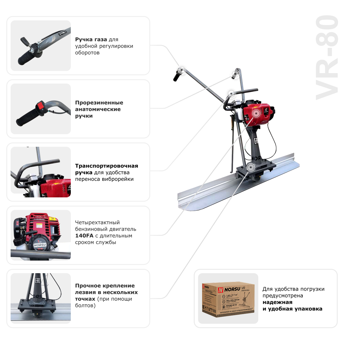 Бензиновая виброрейка NORSU VR-80 с надежным двигателем HUASHENG 140FA позволяет быстро и равномерно укладывать бетон. Отличается прочностью, компактностью, маневренностью, небольшим собственным весом — 15.4 кг. Эргономичная конструкция обеспечивает равномерное распределение вибрации по всей поверхности лезвия, позволяет удобно держать инструмент в руках и маневрировать им без усилий. Опорная ножка на раме надежно защищает элементы управления от загрязнений во время остановки. Объем топливного бака в данной модели составляет 0.65 л.