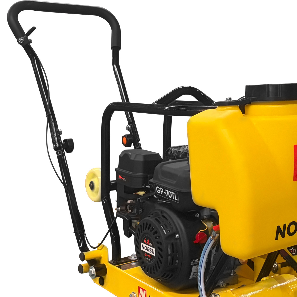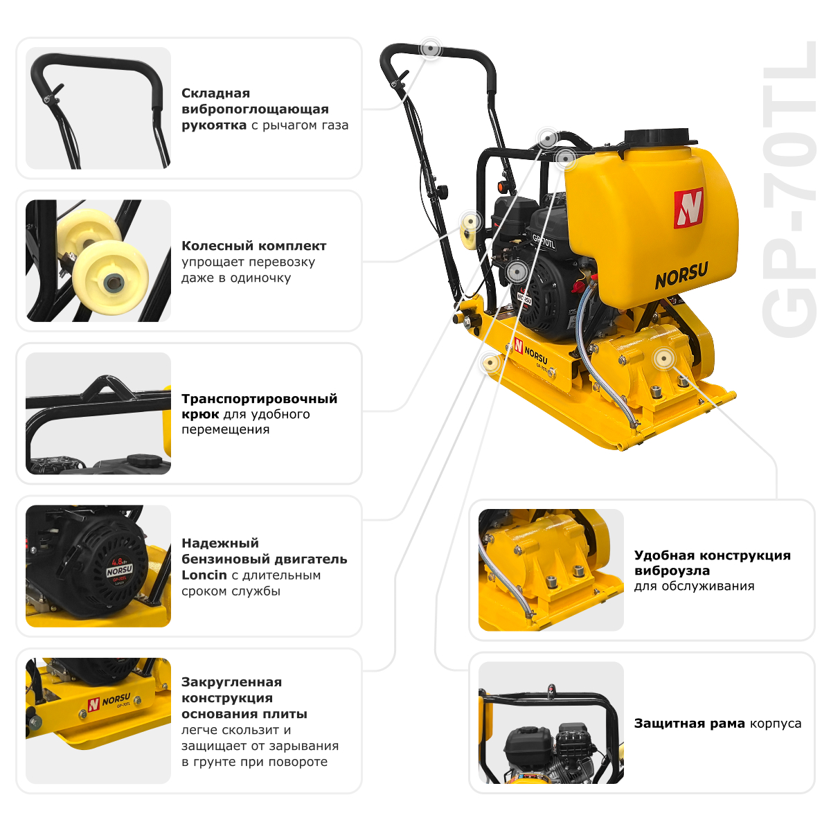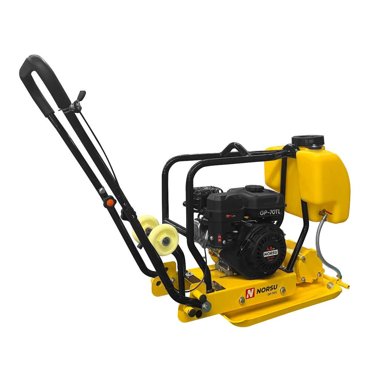 Прямоходная виброплита NORSU GP-70TL (с колесным комплектом) отлично подходит для уплотнения песка, гравия, смешанных грунтов, асфальта. Отличается простотой обслуживания, компактностью — востребована для работы на небольших площадях, например, в узких траншеях, вдоль фундаментов и стен. Подходит для укладки тротуарной плитки. Складная ручка обеспечивает удобство хранения и транспортировки. Оснащена двигателем Loncin H200 мощностью 4800 Вт. Глубина уплотнения модели составляет 200 мм.